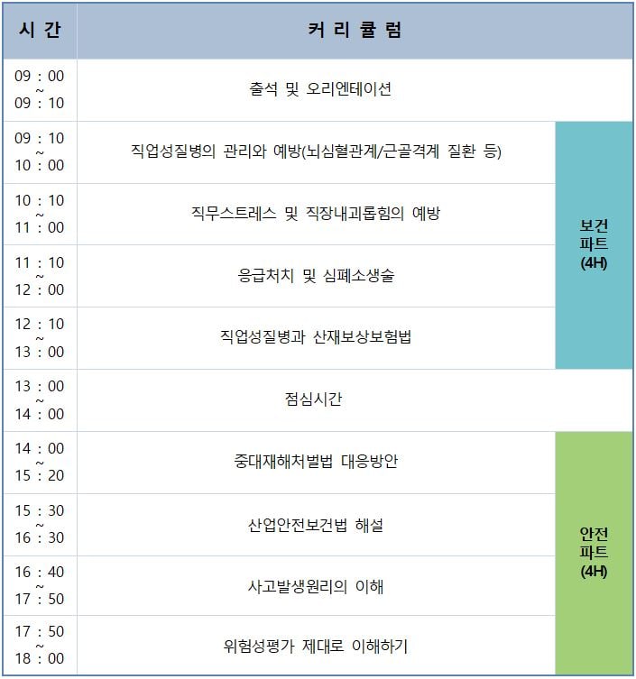 - 교육내용 : 산업안전보건법 31조, 시행규칙 제26조에 의거한 보건 및 안전 교육(하단의 커리큘럼 참조)